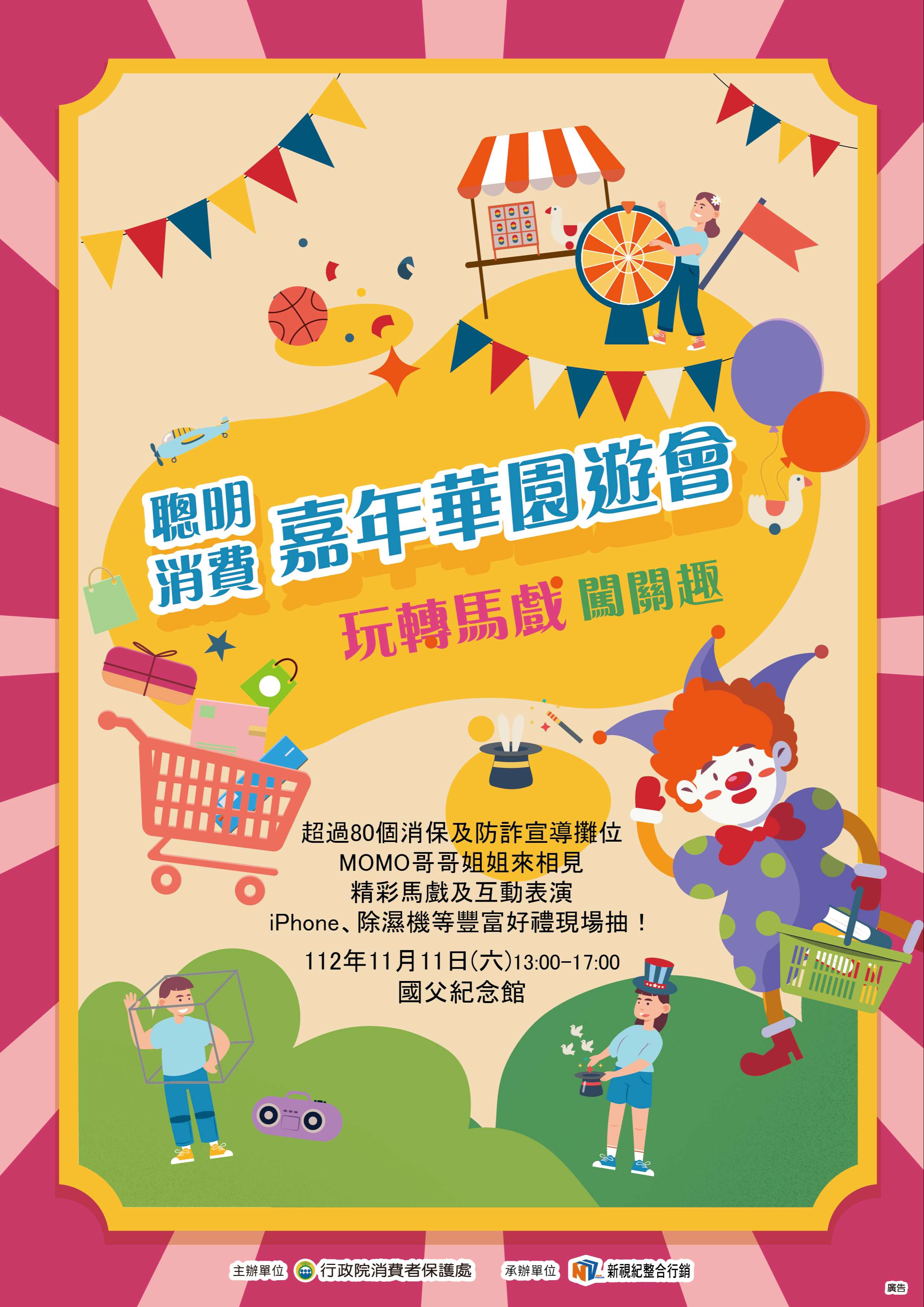 二、該處為強化消費者自我保護知能,訂於112年11月11日(星 期六)下午1時至5時於國父紀念館舉辦旨揭活動,除設有逾80個攤位供學習體驗與闖關抽獎外,並安排魔術、小丑表演與電視兒童臺哥哥姐姐唱跳、部會上臺秀等舞臺表演,透過寓教於樂方式,傳達重要消保與防詐觀念。