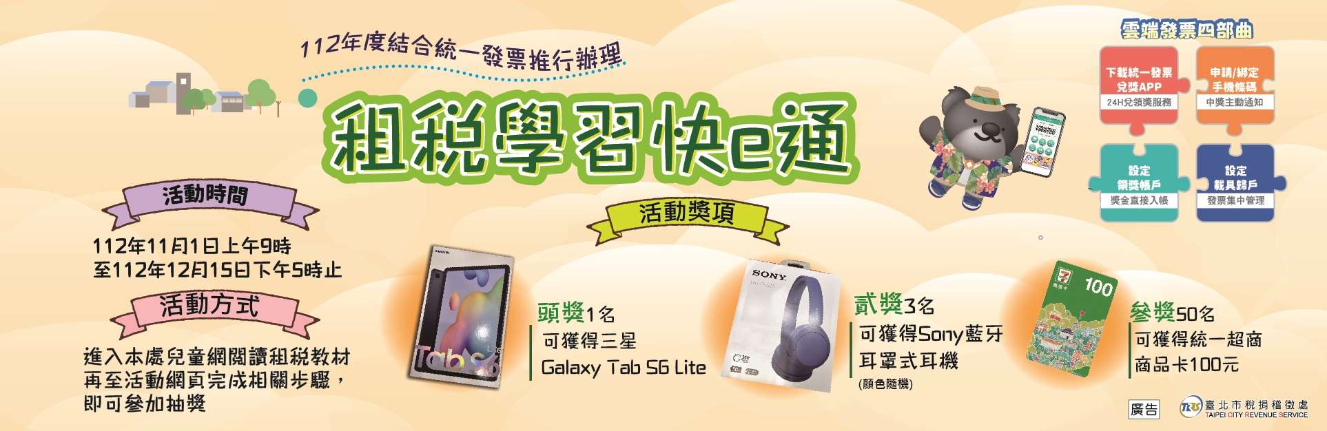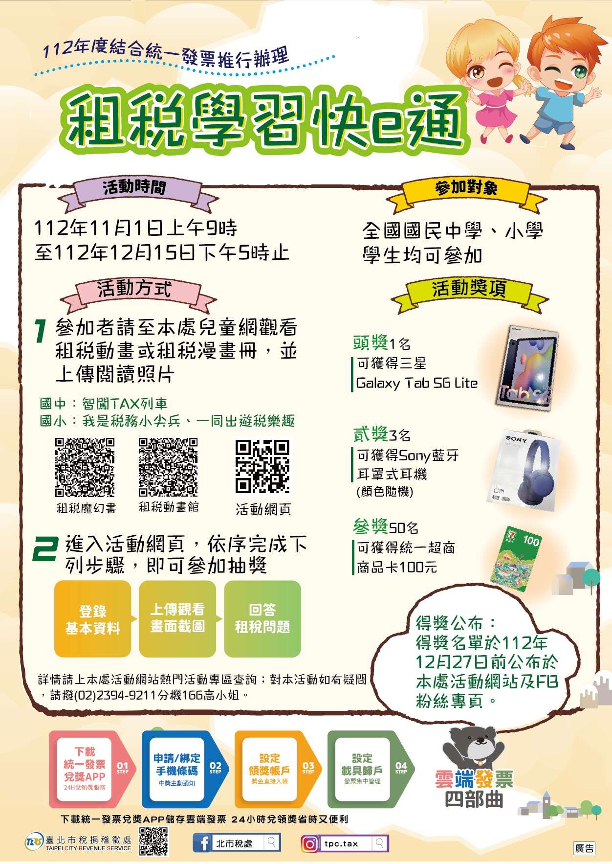 (二)活動內容:國中、國小學生於活動期間至「臺北市稅捐 稽徵處兒童網」觀看租稅教育動畫或漫畫,將閱讀情形 拍照上傳活動網頁,並正確回答租稅問題,就有機會獲 三星Galaxy TabS6 Lite、Sony藍牙耳罩式耳機及統一超 商商品卡100元等多項好禮!
