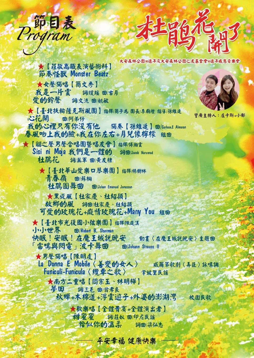 杜鵑花開了感恩音樂會將於3月30日下午14時00分至16時00分於大安森林公園露天音樂台舉辦,邀請您共享春日的午後時光!