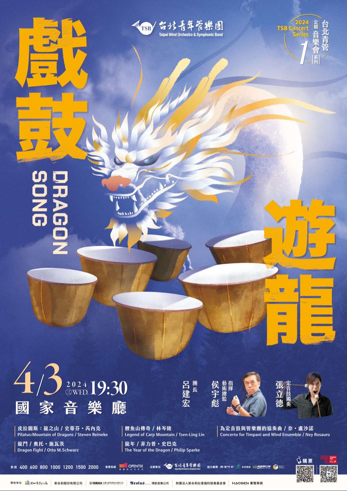 一、2024台北青管定期音樂會系列I,由侯宇彪教授指揮台北 青年管樂團演出;帶來多首與東西方神獸龍有關之樂曲, 氣勢磅礡。並邀請廣州交響樂團定音鼓首席張立德擔任協 奏曲獨奏,精彩可期。