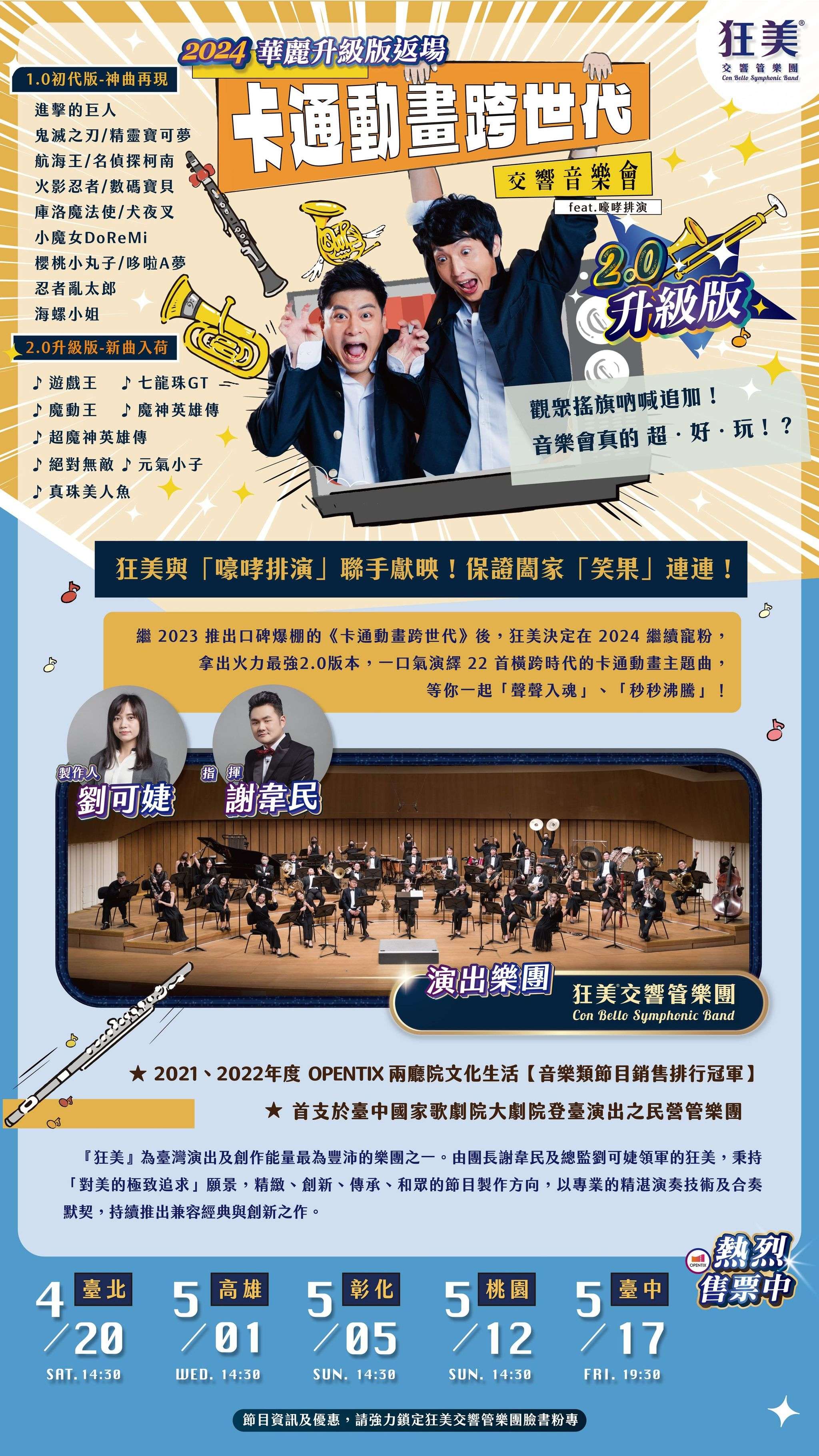 一、節目介紹:孩提時期,我們從動畫作品裡認識多彩世界。 長大成熟後,在動畫裡找到共鳴和新意。2024《卡通動畫 跨世代》火力最強 2.0 版本,精選多部話題度最高的動畫 作品,一口氣演繹 22 首橫跨時代的卡通動畫主題曲,等 你一起「聲聲入魂」、「秒秒沸騰」!