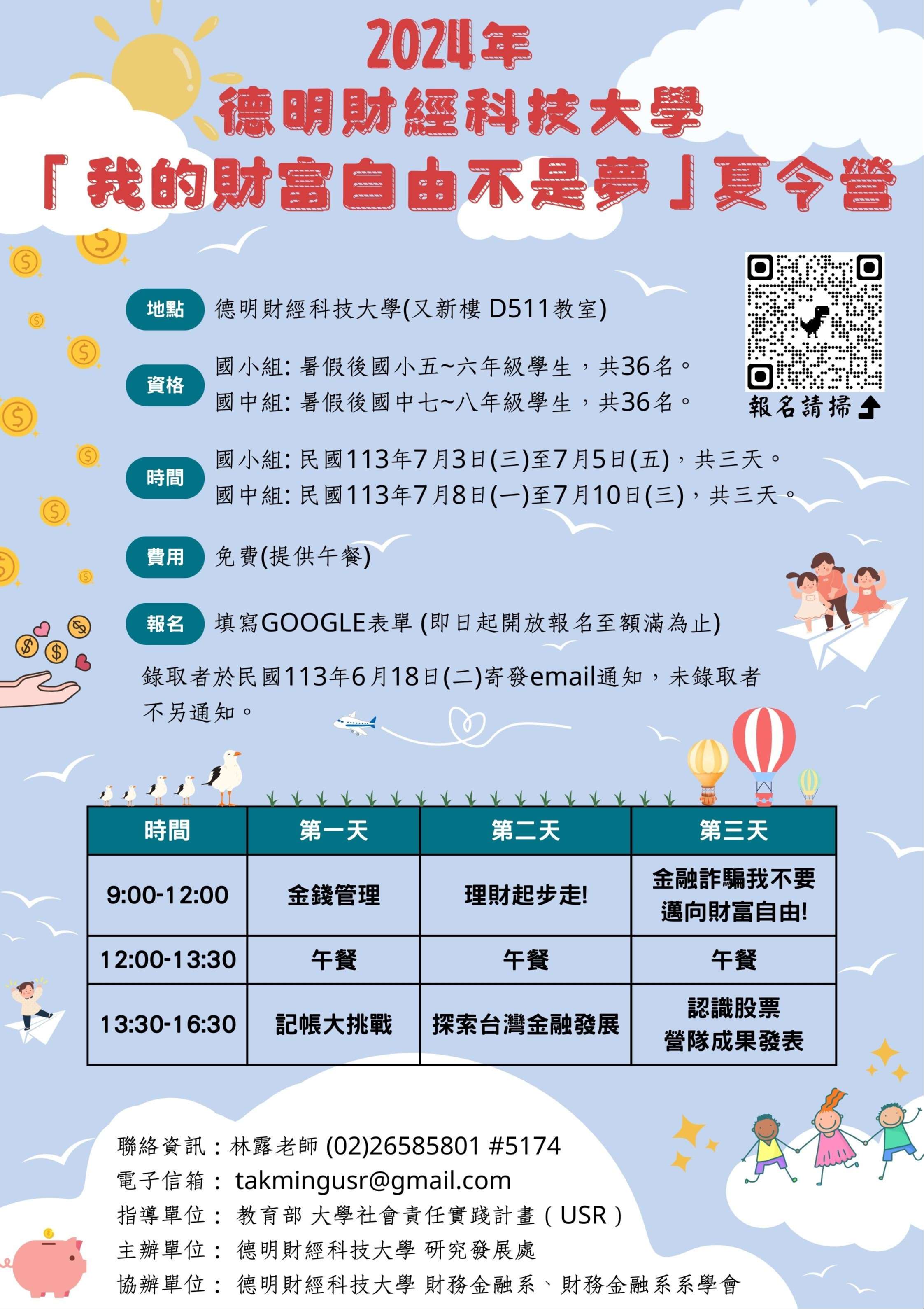 八、檢附營隊簡章與宣傳海報電子檔如附件。 九、如有相關問題,請逕洽活動聯絡人林露老師,電話:02- 26585801轉分機5174,電子信箱:takmingusr@gmail. com。