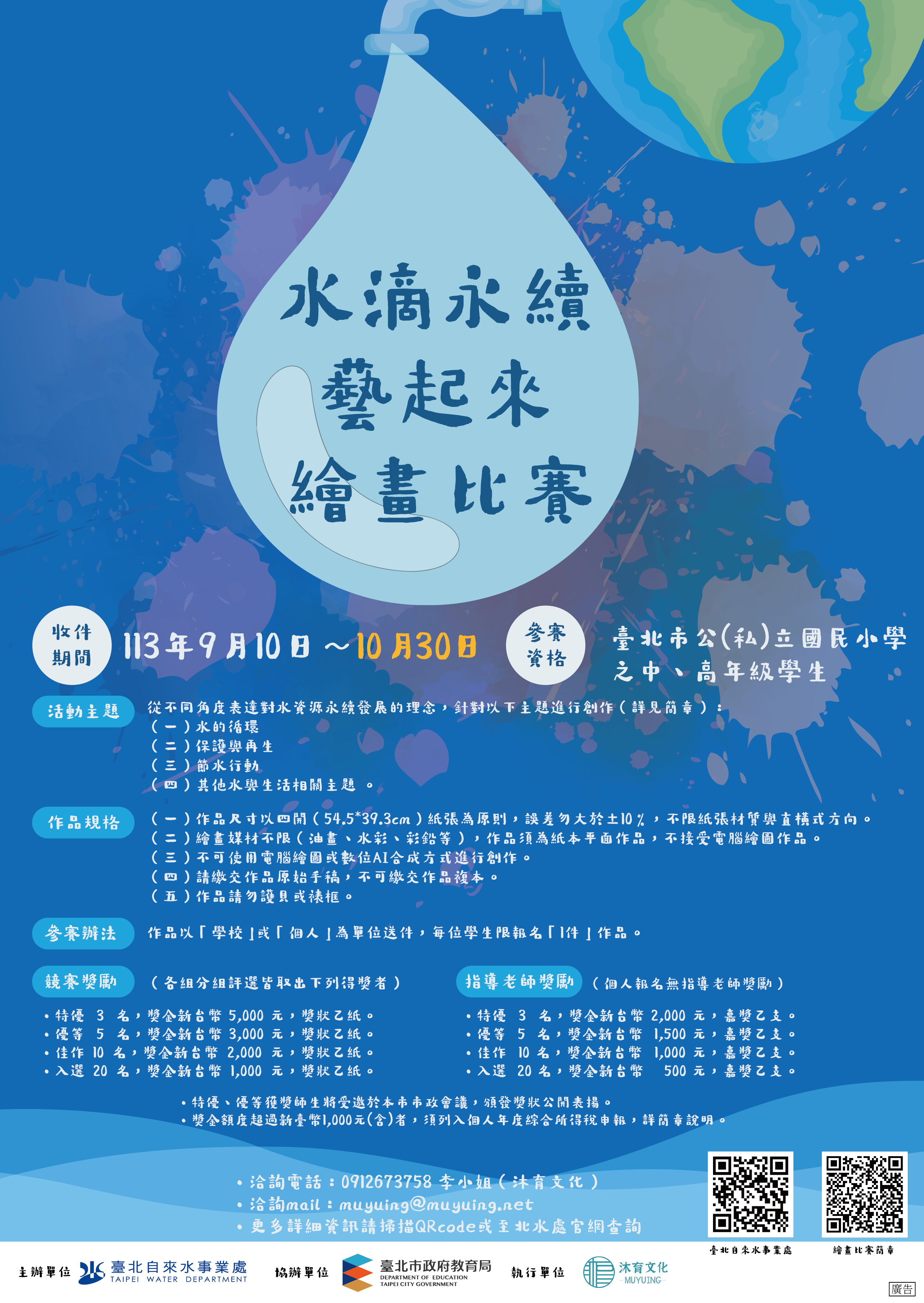為因應山陀兒颱風影響作業時程,及提升節水教育推廣成 效吸引更多學童參賽,原「繪畫比賽」比賽報名期限自113 年10月16日延至113年10月30日,並開放學童以個人參賽方式報名。