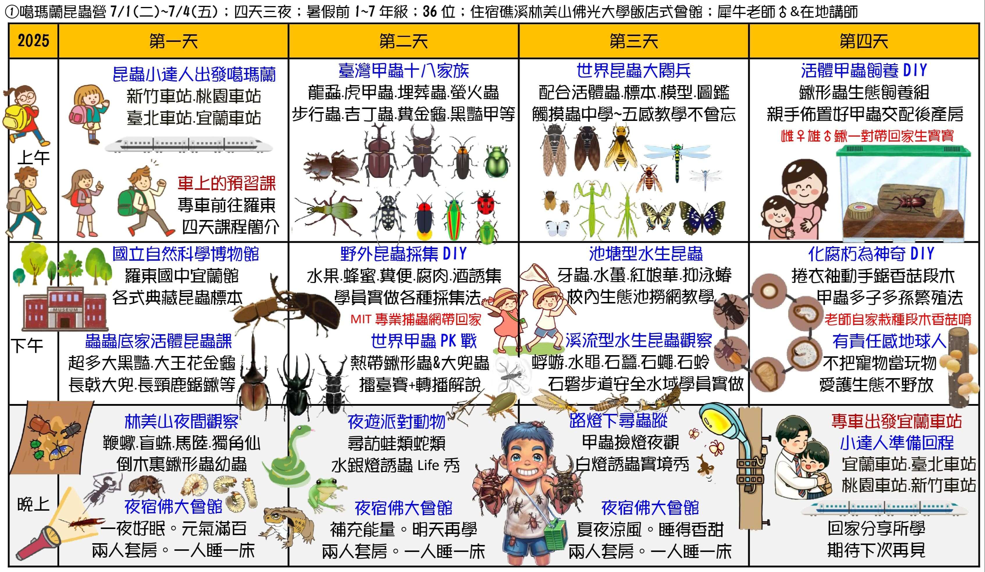一、2025生態素養夏令營日期7/2~8/26,招生涵蓋大班-九年級 學員,請依不同課程分齡參加,詳細請見營隊網站 https://www.i3nature.com.tw/。