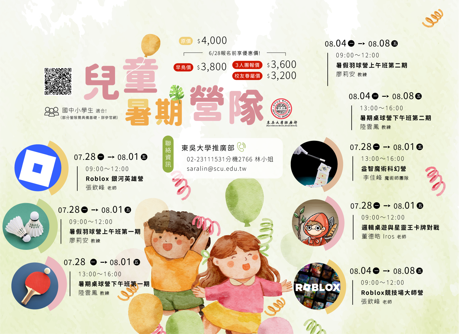一、本次共計招生九個研習營:Roblox銀河英雄營、邏輯桌遊 與星靈王卡牌對戰、益智魔術科幻營、暑期桌球營下午班 第一期、 假羽球營上午班第一 、Roblox 競技場大師營、 暑期桌球營下午班第二 、暑假羽球營上午班第二 、 籃球 主播營 。