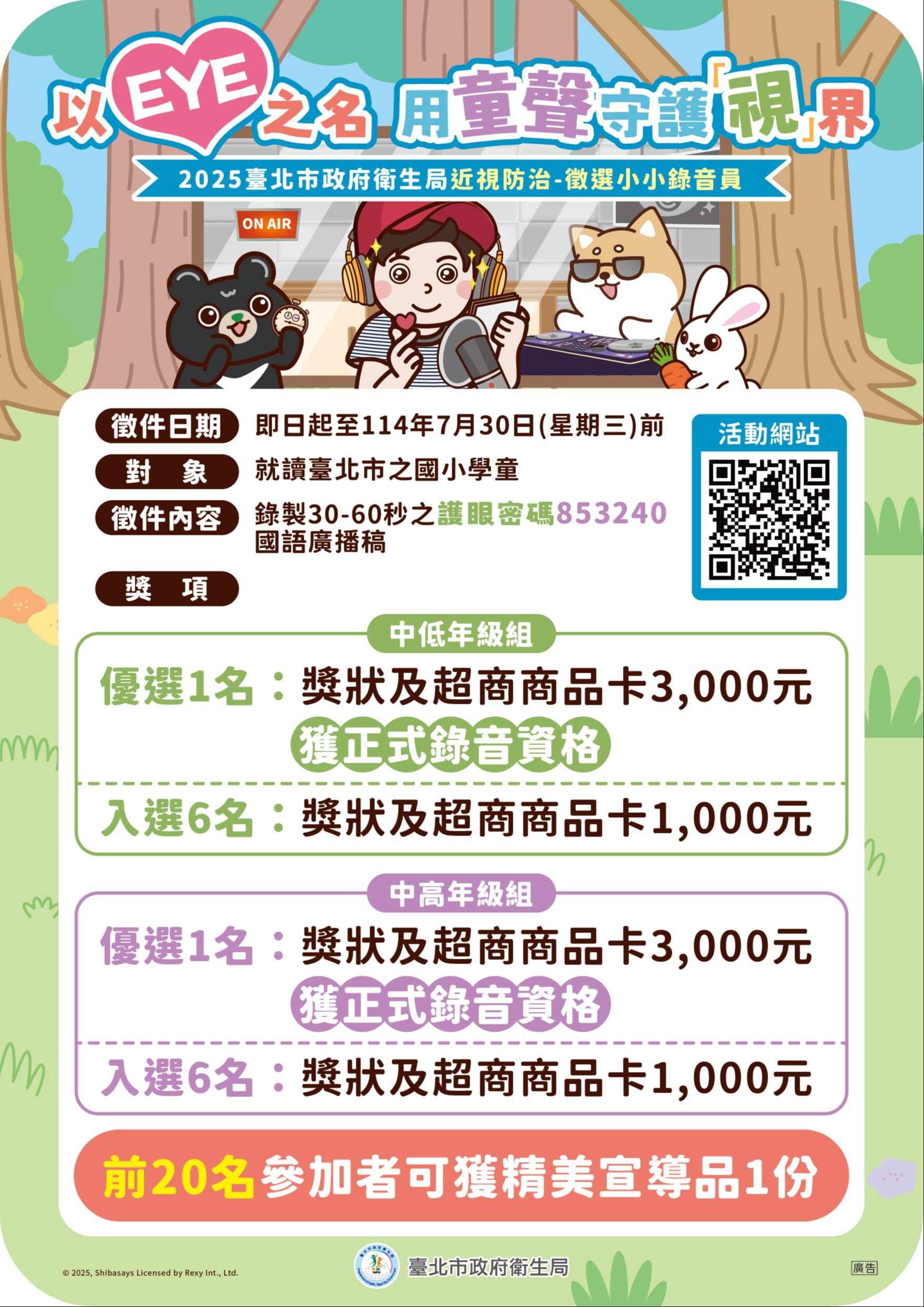 四、活動簡章詳本局網站/高度近視防治專區(網址: https://pse.is/7tpsx7),檢附活動圖卡(如附件)1 份,請協助刊登校網及轉發家長LINE群組,鼓勵學童踴躍參加。