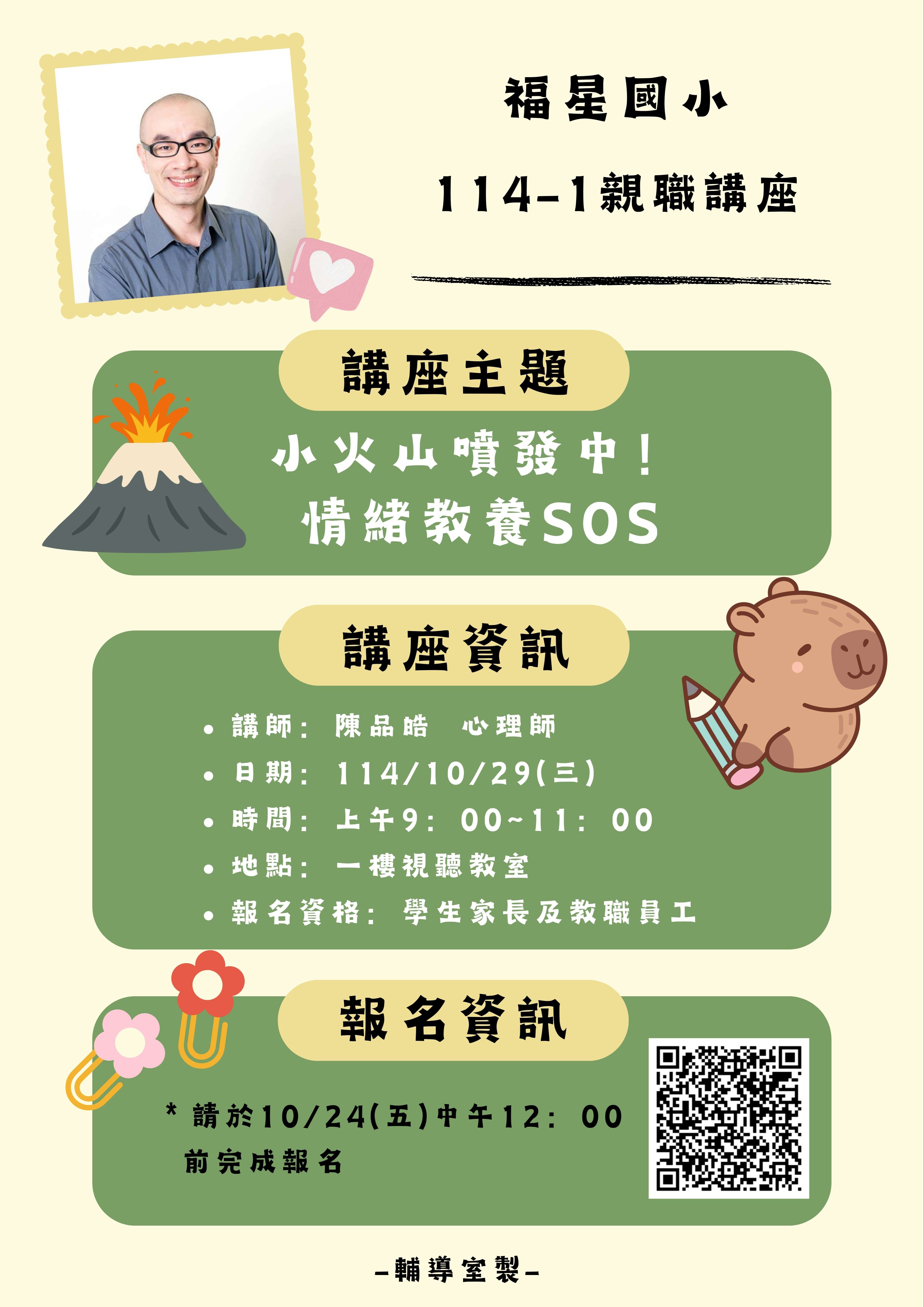 (五)地點:福星國小1樓視聽教室 (六)報名方式:請於114年10月24日(五)中午12:00前完成報 名(https://forms.gle/XP6uY7dA2xnSKXsM8)。