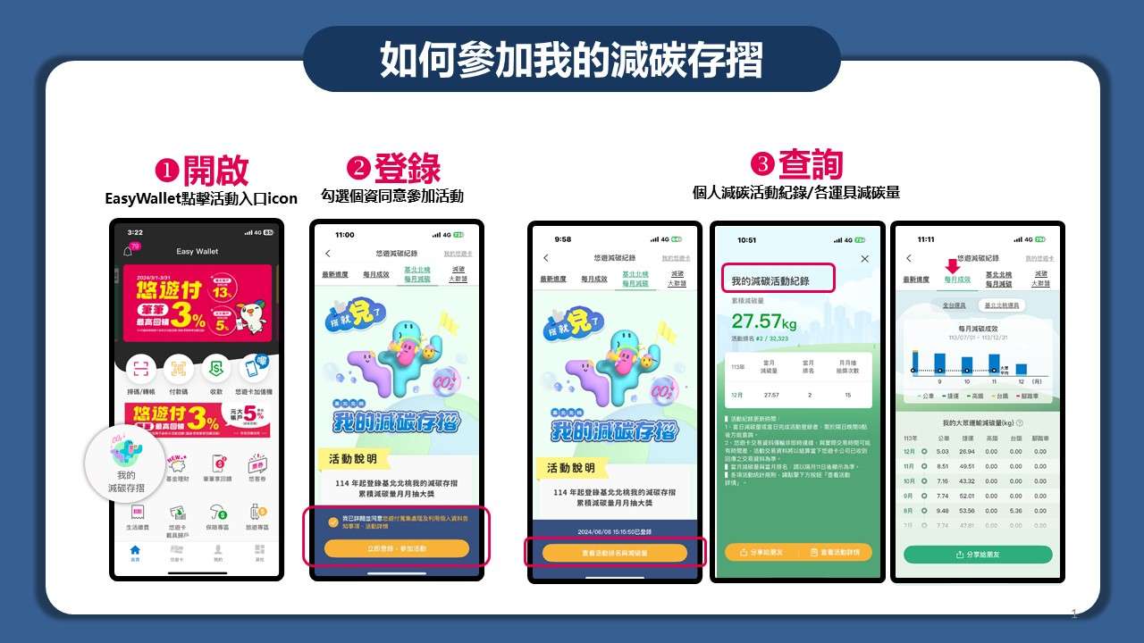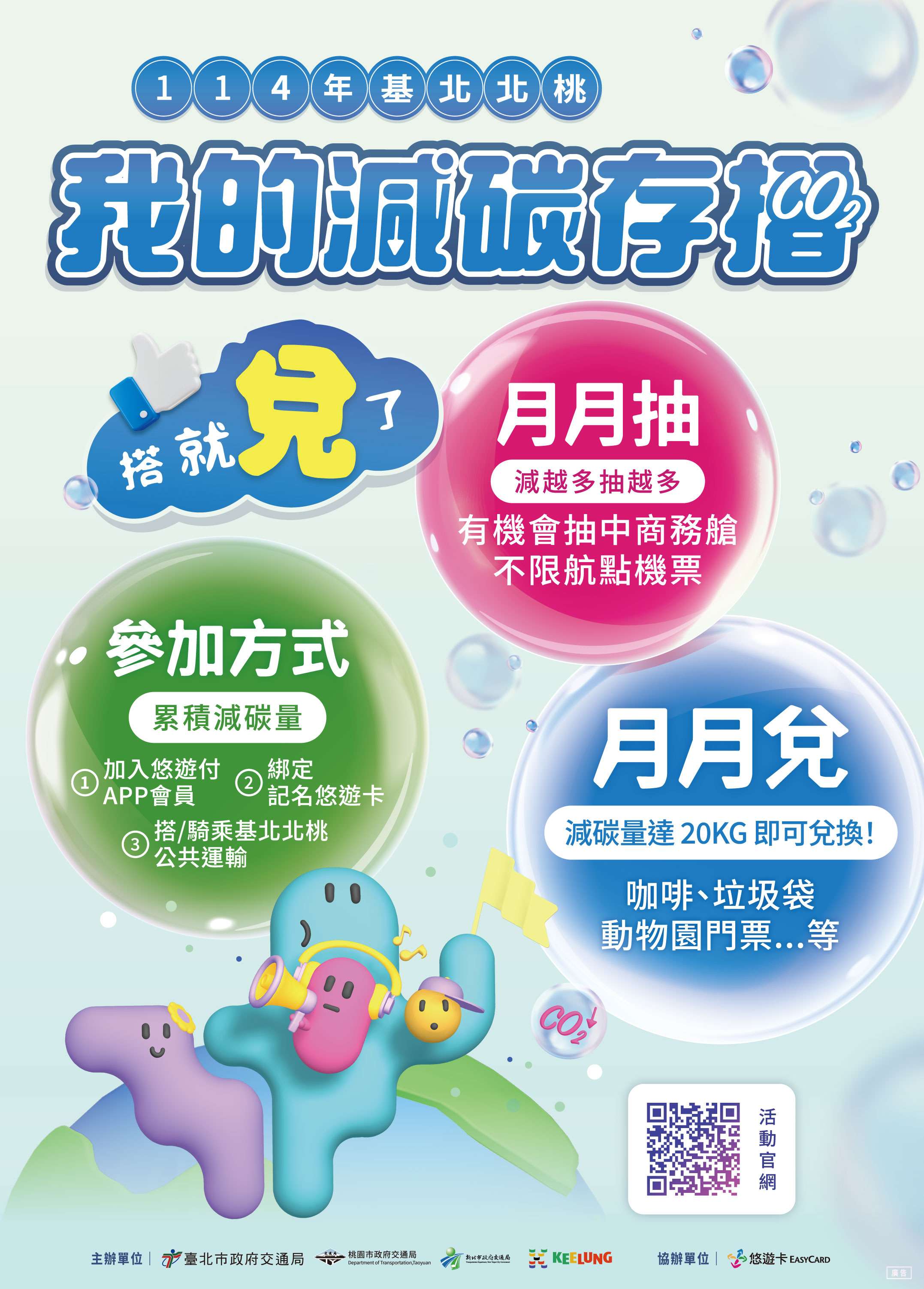 一、為攜手市民多加使用公共運輸,以朝淨零碳排目標前進, 由政府、企業一起帶動全民綠運輸減碳,113年由基北北桃四市交通單位、公共運輸業者及悠遊卡股份有限公司共同 推動,114年度擴大辦理並增加兌獎制活動,民眾累積達一 定減碳量即可登錄兌換獎項,提高民眾參與誘因,活動辦 理期間自114年1月1日至12月31日止,詳細內容可至本活動 官網查閱114年活動資訊(https://co2- passbook.com /)。