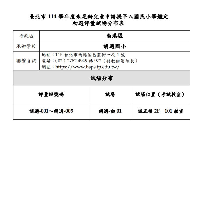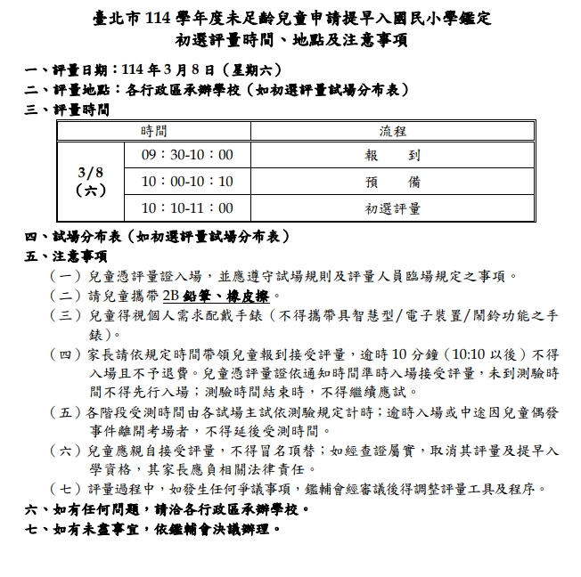 本校辦理(南港區)臺北市114學年度未足齡兒童申請提早入國民小學鑑定初選評量時間、地點及注意事項附檔資訊截圖供家長參考,請參與家長詳閱附件。