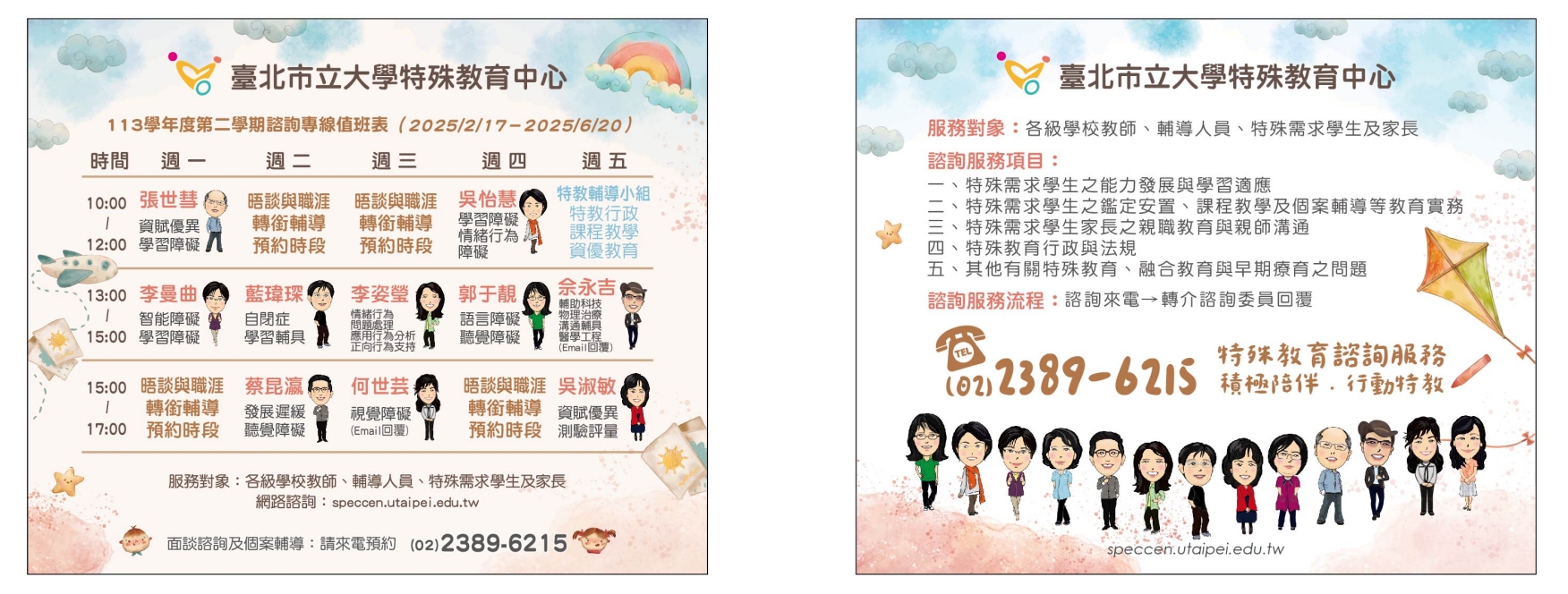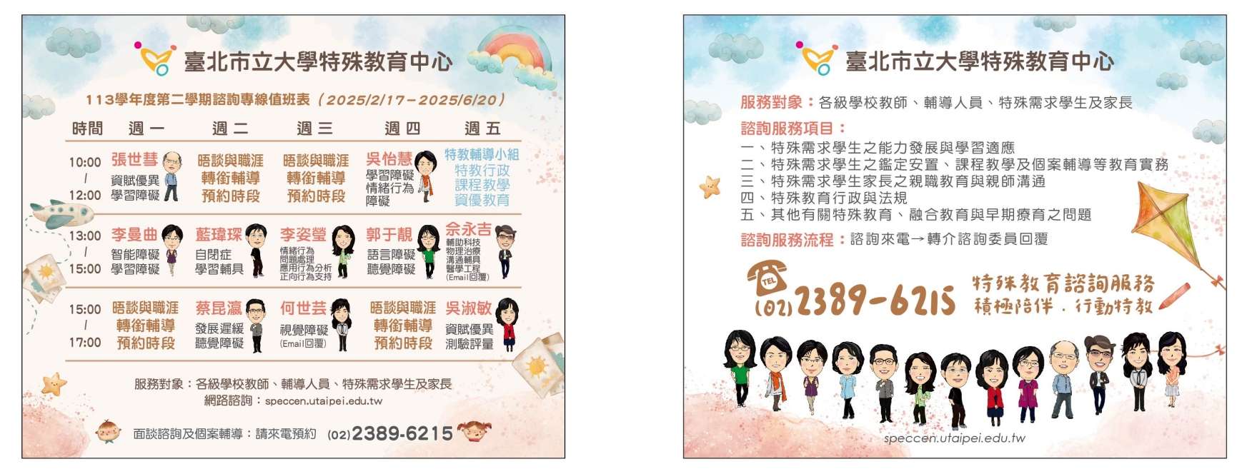 四、檢附市大特教諮詢專線輪值表小卡及海報電子檔各1份(紙 本小卡及海報另行送達)。