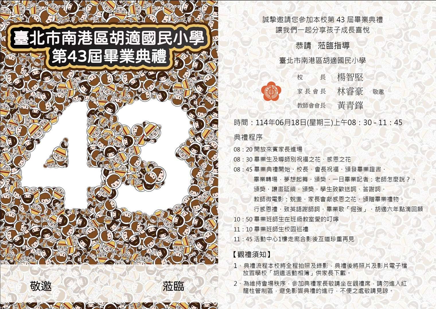 胡適國小第43屆畢業典禮將於6/18(三)08:30開始~ 可點選連結搶先觀看預告片喔!