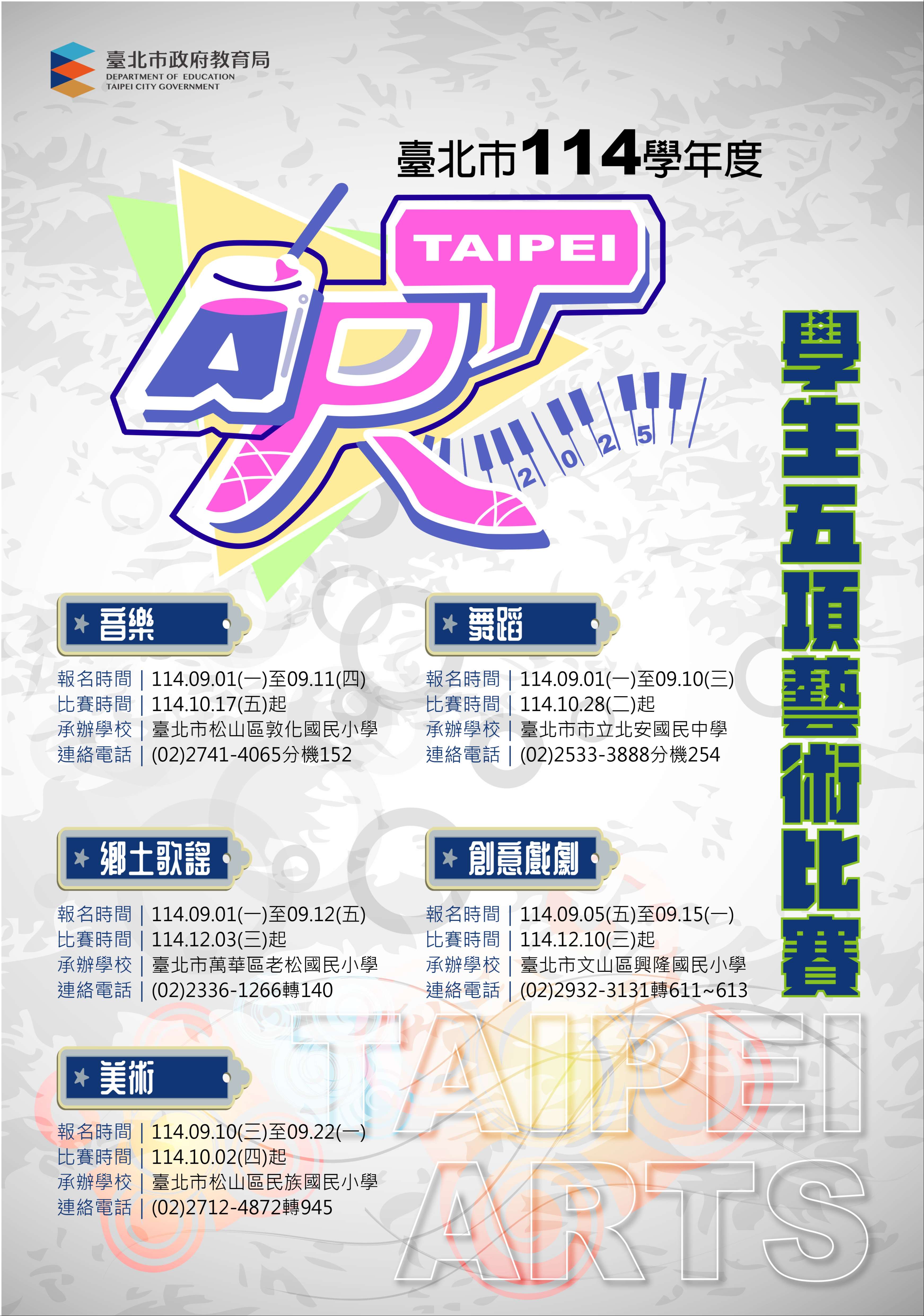 五、檢附本市114學年度學生五項藝術比賽時程表及海報。實施計畫電子檔可至本市五項藝術比賽網站(網址: https://www.tpcityart.tp.edu.tw/Home/NewContent/484 )下載。