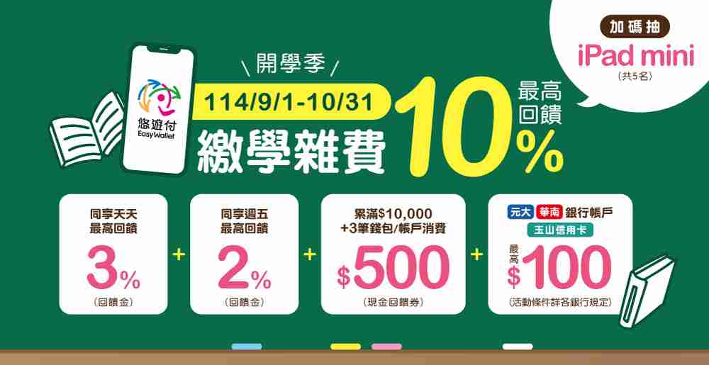 三、家長透過簡易步驟即可完成悠遊付親子綁定(https:// reurl.cc/QWAyNo),為鼓勵家長使用無現金繳費服務 , 悠遊卡公司亦提供相關獎勵活動,請貴校協助推廣予家長、學生及校方人員知悉相關事宜,以利達成學校場 域無 現金校園目標,活動內容如下: (一)活動期間:114年9月1日至10月31日。 (二)活動內容:活動期間當月使用悠遊付每筆扣款享3%( 限 量,每戶回饋上限100元)悠遊付回饋金,另累積消費新 臺幣(以下同)10,000元加3筆帳戶或錢包消費即回饋 500元指定通路現金回饋券,另活動期間成功使用悠遊付 繳學雜費一筆,可參加抽獎抽iPad mini(共5名),其 他活動細節請參考活動頁面。