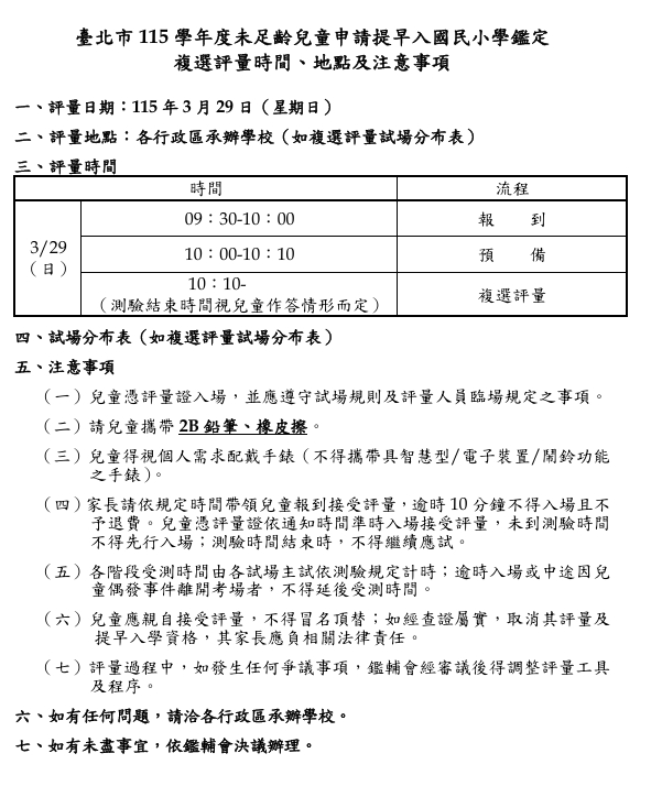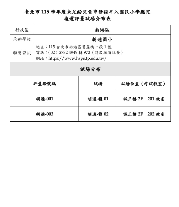 臺北市115學年度未足齡兒童申請提早入國民小學鑑定複選評量時間、地點及注意事項(南港區胡適國小)